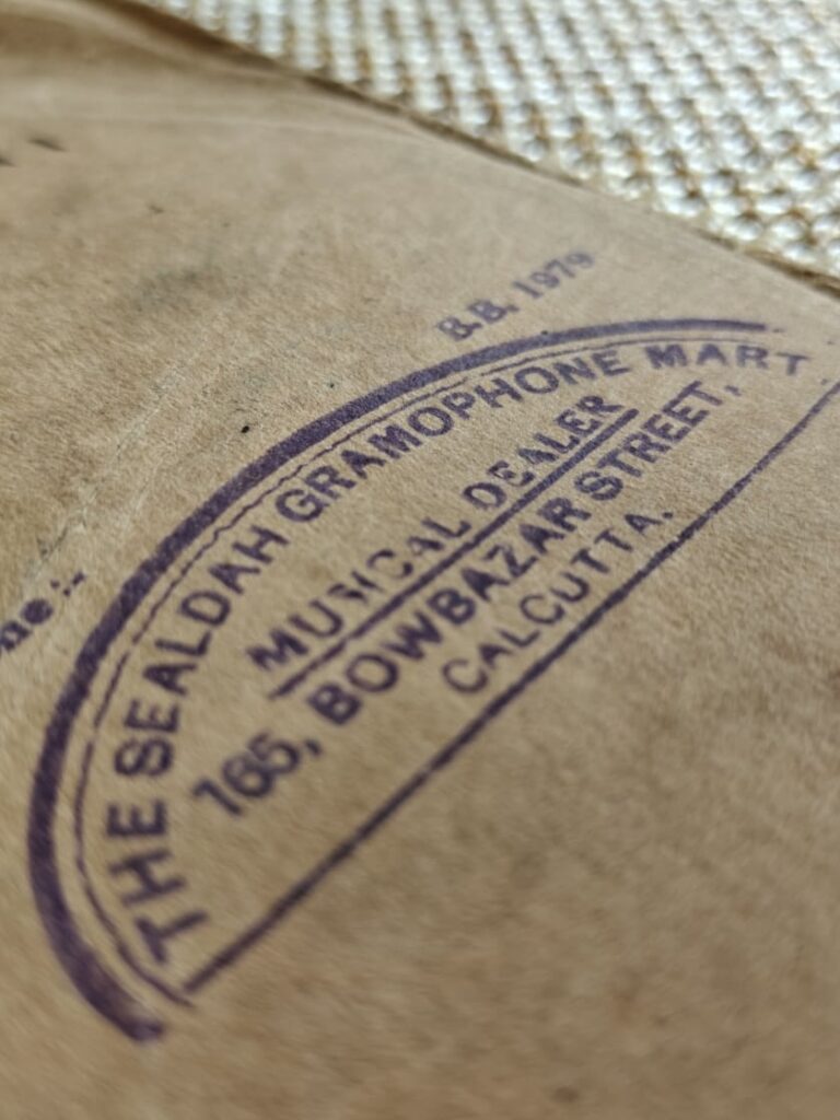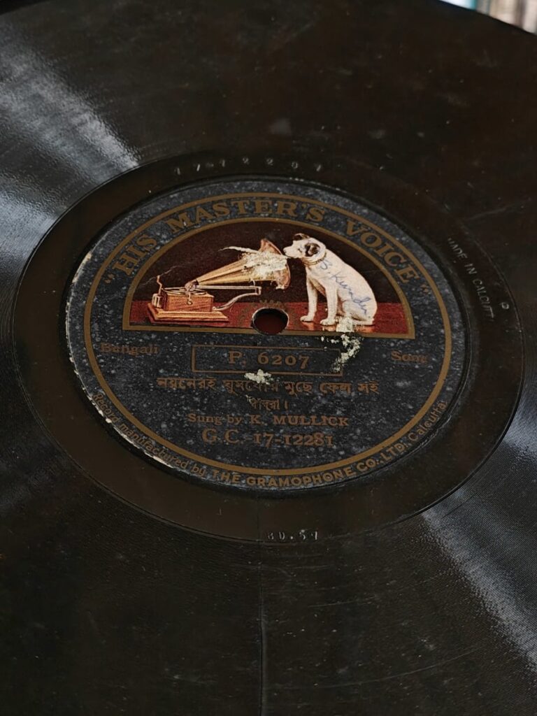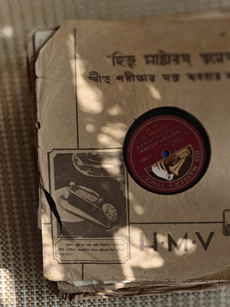 This machine speaks the language of shellac alone; later vinyl would have been alien to its weight and pressure. By the early 1920s, HMV gramophones circulated widely across Europe, particularly in university towns and provincial centres where British-made instruments symbolized both modernity and continuity. My mother’s grandmother recalled that her husband, Dr. R. C. De acquired it in Aincourt, Seine-et-Oise and brought it home by ship. Posted subsequently as Medical Director of B.B Civil Hospital in Jorhat, Assam, he carried the gramophone with him into the colonial margins, where it must have sounded improbably European and yet profoundly intimate. On retirement, it returned with him to Calcutta, passing eventually to my grandfather, Dr. Sudhir De, and settling into the quieter inheritance of family life.