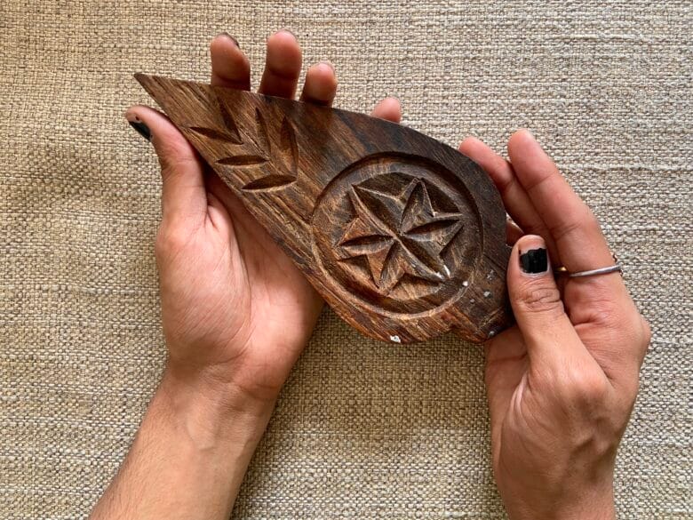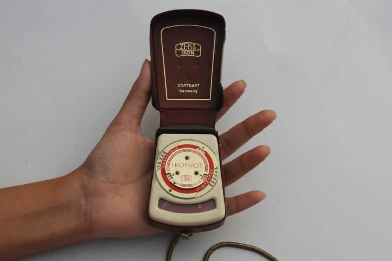 An ikophot is a handheld meter made in the 1950’s by Zeiss Ikon in Stuttgart, Germany. My grandfather Shyamal Kumar Majumdar probably procured this in the 1960s from Fancy Market, Kidderpore, Kolkata. It has a bubble glass at the front that takes in the light, which then drives the meter needle. It is covered by a little black lid which can be removed while using the device.