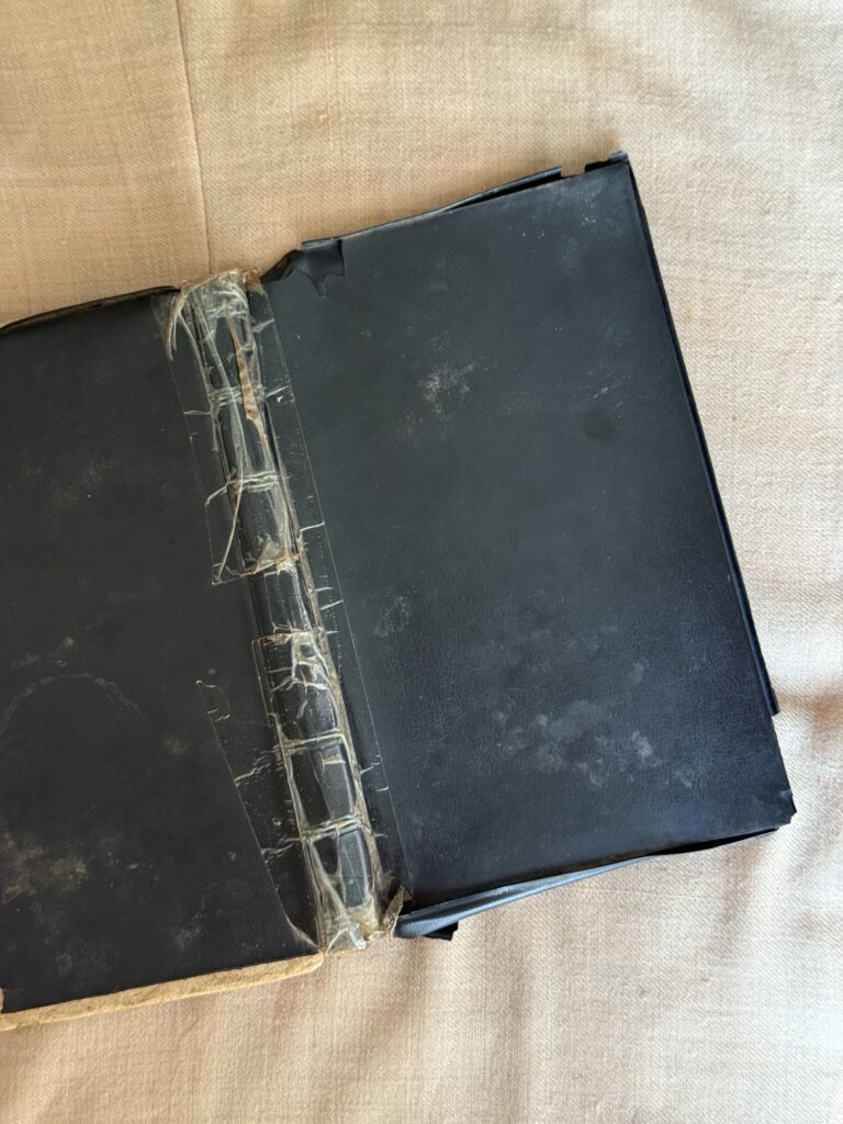 The diary is black in colour and has a leather texture. Due to the passage of years, it has worn out, and the pages have turned a yellow-ish brown. A generous amount of tape secures the spine of the book. The diary measures around 12×10 inches, and the recipes are mostly written in blue ink that has bled through the page, because of the age of the diary and thinness of paper. There are little notes under some recipes, indicating that these were written quiet meticulously and perhaps tweaked or edited during the process of cooking.
