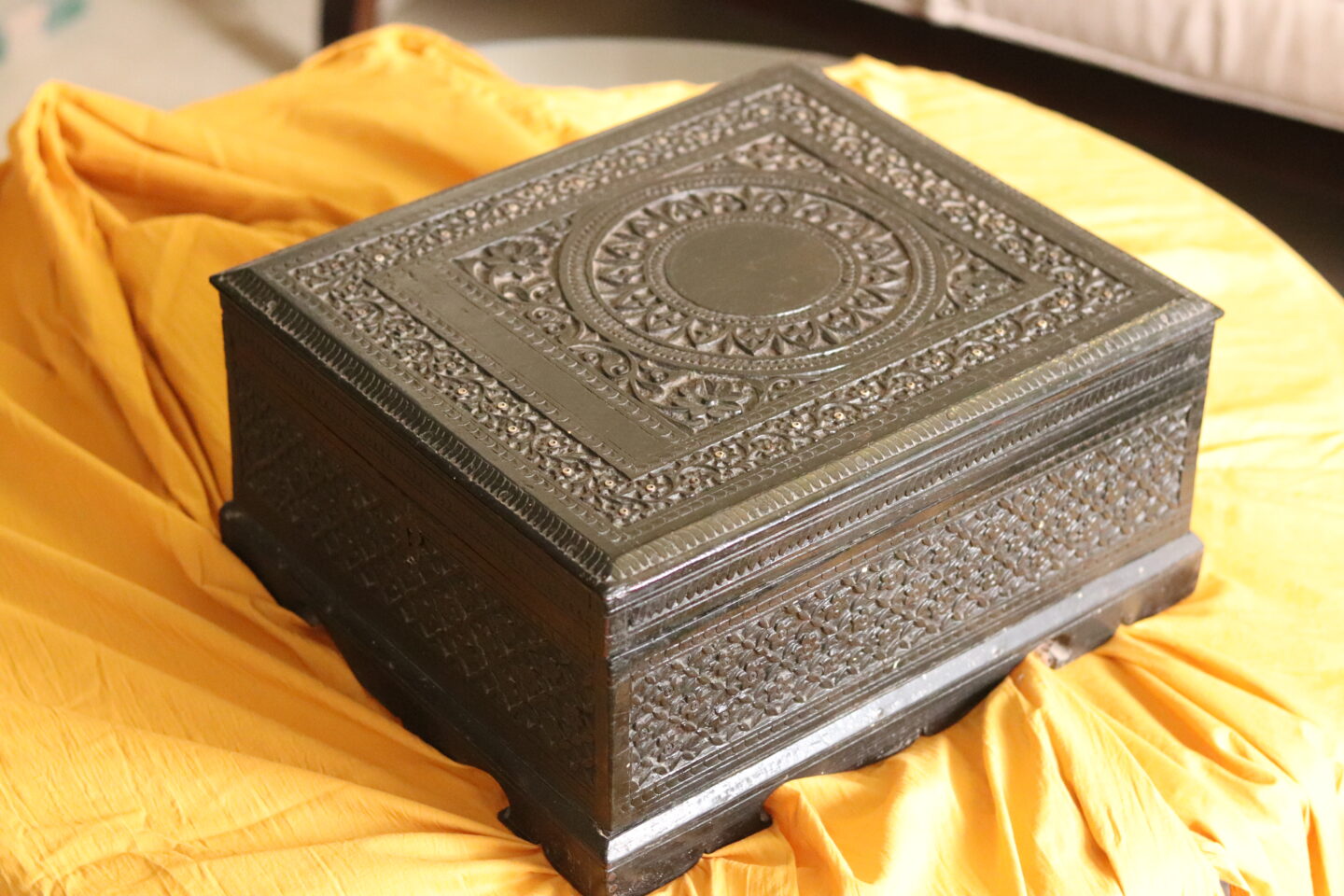 Sitting sizeably, at 14 inches in length and 12 inches in breadth, this dark wood box could easily be mistaken for an ornately carved low side table. However, come closer and the magic inside is revealed. The vanity cum jewellery box from the early 1900s, sits pristinely preserved in the hands of its third owner.