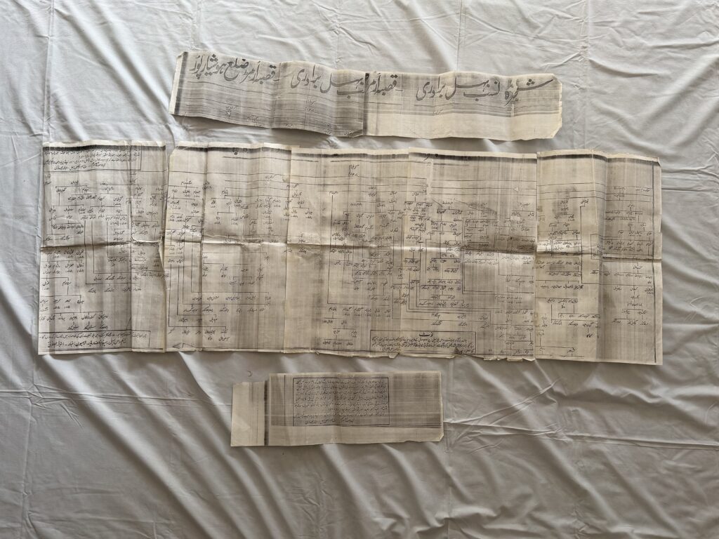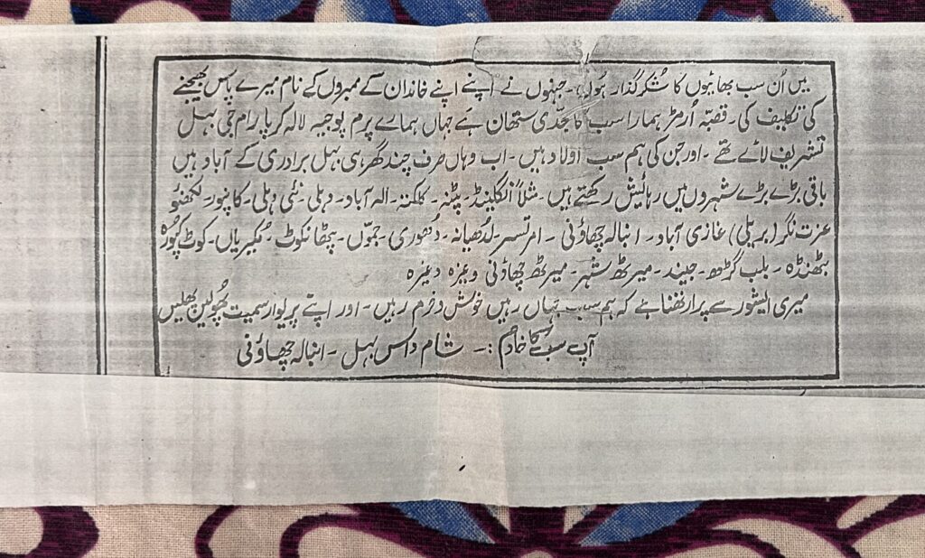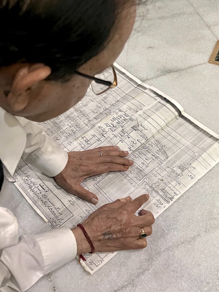 Now, holding this sheet, I tried again to read the words. The letters felt familiar but distant, like remembering a song you once knew by heart but can no longer hum smoothly. So I took the paper downstairs to the living room where Daddyji was reading the newspaper. I told him we found something that looked like a family tree. He took the sheet gently, his hands instinctively careful with it. He unfolded it, leaned forward, adjusted his glasses, and read aloud in his soft Punjabi-inflected voice: “Shajara-e-Nasab, Bahl Baradari, Qasba Urmar, Zilla Hoshiarpur.” The words came easily to him, as though they lived somewhere familiar in his mouth.