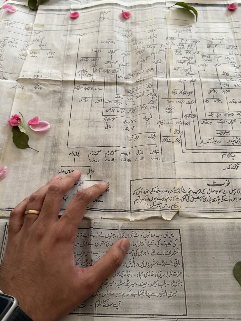Upstairs, my parents were clearing their wardrobe. A stack of insurance folders, old envelopes, folded shawls, papers that had lain dormant over years. In the middle of all that, a thin and frail piece of paper slipped out, wrapped in a mauli. My mother opened it carefully, spread it out flat on the bed, and called me over: “Raunaq, yeh dekh, this looks like some kind of family tree.”