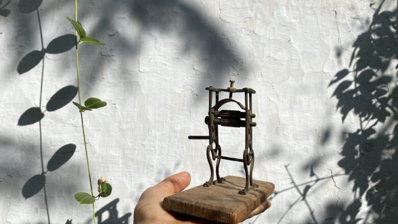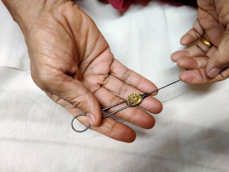 This beautiful thing – I was told by aaji – was a crochet needle almost 90 years old! I could never have guessed it was a needle merely from the shape. I asked her where the hook was and she smiled and slid the oval silver mechanism to the top, pulling with it a hidden hook, extending its size to 12cm.