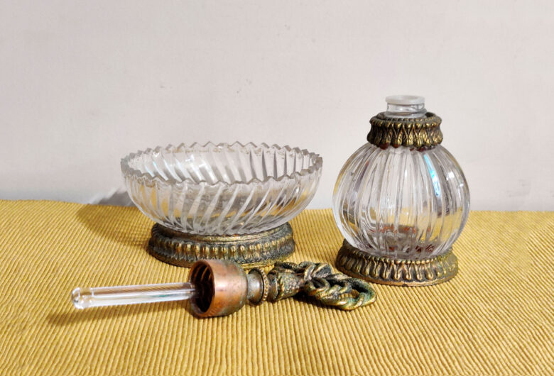 This vanity set of four included an oval-shaped mirrored tray, a powderbox, a photo frame and the ittardan, all made by an American brand called ‘Stylebuilt’, which rose to popularity first in the 60’s, with its signature metallic gilding.
