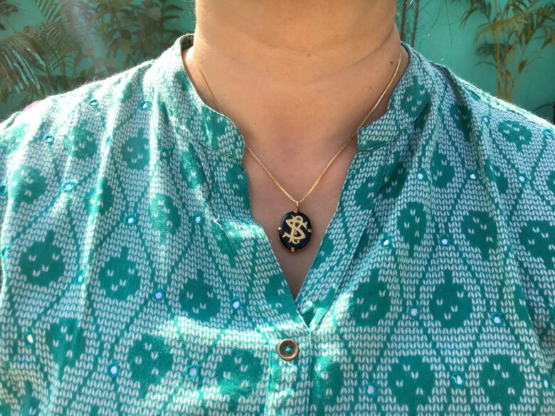 Set in black jade, the pendant has the initials of my grandparents inscribed on it in gold, intervowen within one another. S for Suraksha and P for Prem. My grandfather got this handcrafted at Kanjimal Jewllers in Chandni Chowk sometime in the mid-1950s and gifted this to my grandmother on one of their early wedding anniversaries.