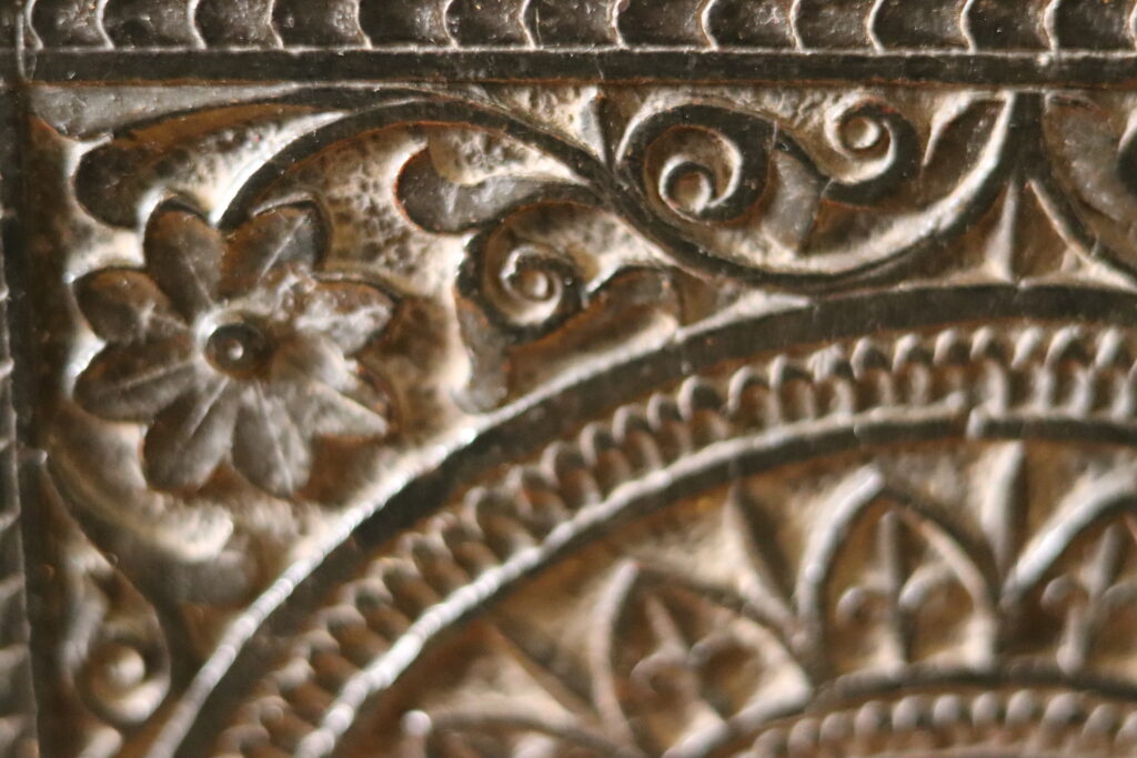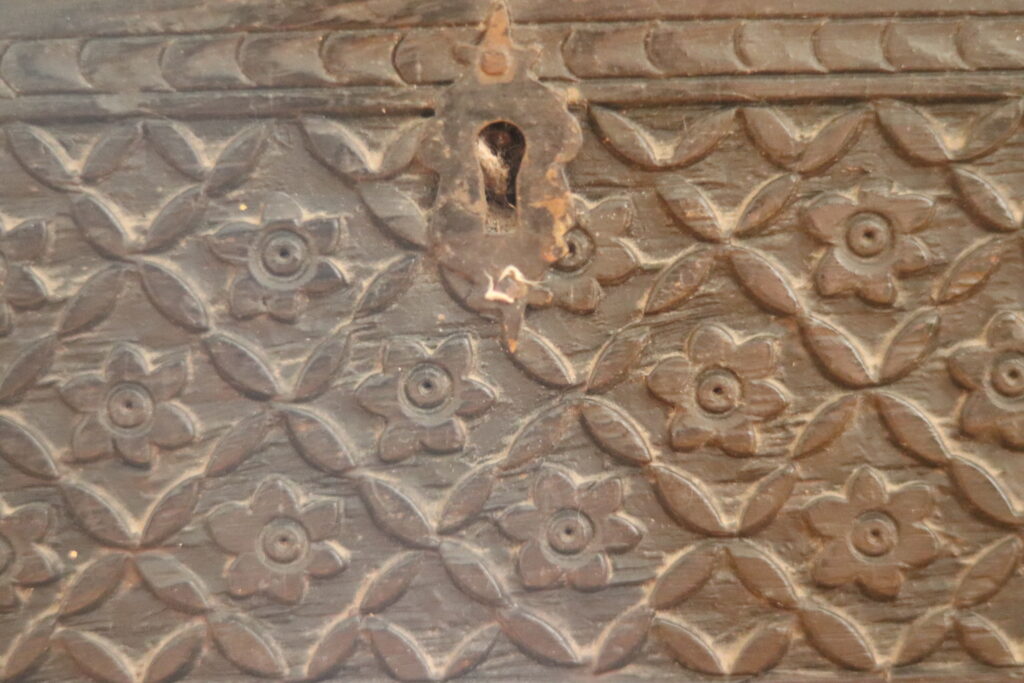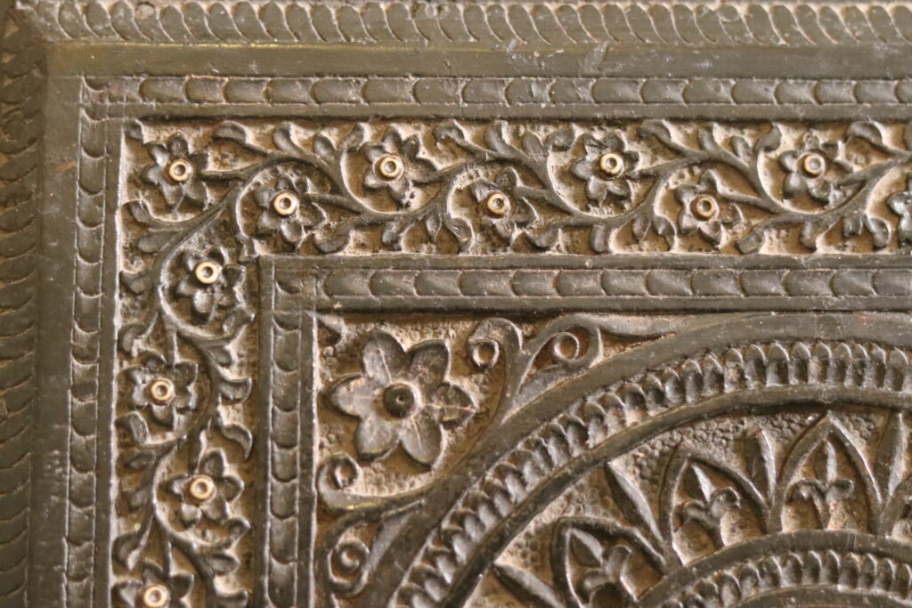 “The box fascinated me since I was a young girl, packed away in a cotton cloth in the trunk – it was a mystery for us kids”. In 1987, Parvati quietly passed away in Nainital. She continued to live with her daughter till the end, leaving behind a legacy of a life well lived and fought. However, the question still lingered in my mind – What were the origins of such intricate woodwork – and how did it reach the hills? The outer wood of the box is dark, probably ebony. It features a smooth circular disc, surrounded by a ring of stylised flowers similar to the fluer-de-lis. Concentric bands of beading and scalloped lines radiate outward, creating depth and rhythm. On a closer look, the pistils of the flower are whitish – yellow and look like ebony/bone inlay work.