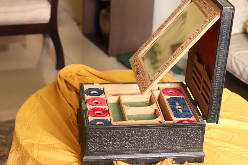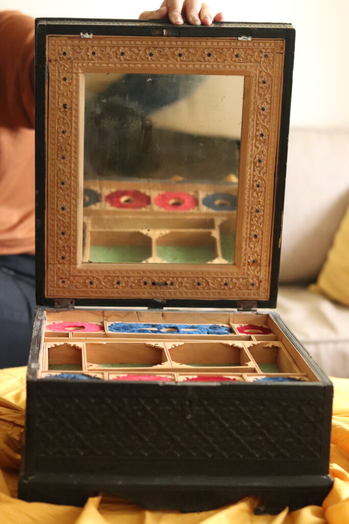 The dark wood box, sitting in my aunt, Vandanas’s drawing room became another object to add to the archive’s wide tapestry. Sitting sizeably, at 14 inches in length and 12 inches in breadth, it could easily be mistaken for an ornately carved low side table. However, come closer and the magic inside is revealed. The vanity cum jewellery box from the early 1900s, sits pristinely preserved in the hands of its third owner. Originally, it belonged to Parvati, who passed it on to her daughter (Prema) who then gave it to her daughter and my aunt (Vandana). Never actually used, it was carefully passed down across three generations of daughters. “The box belonged to my grandmother, and we were told it was a part of her bridal trousseau”, says my aunt Vandana.