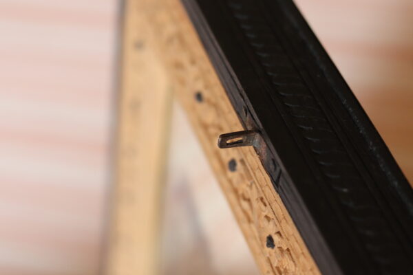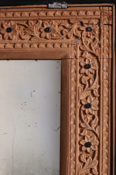 These compartments are lined with velvet fabric pads in deep hues—indigo blue and a warm crimson red. Each of these pads has a circular opening at its centre, like a recessed ring or socket, possibly meant to cradle round or cylindrical objects. Beneath the compartments sits the main body of the box, lined in a rich red fabric. There is a certain thoughtfulness in its delicate design, meant for careful care and handling. The frame of the mirror is carved from pale sandalwood and decorated with a continuous floral vine that runs along the edges. Small flowers emerge at regular intervals, with black pistils connected by curving stems and leaves. These dark pegs or studs are set into the frame at intervals, likely both functional and decorative, anchoring the mirror securely while punctuating the floral pattern. We can see slight irregularities and fine cracks, softened edges, and tool marks—signs of age and handwork.
