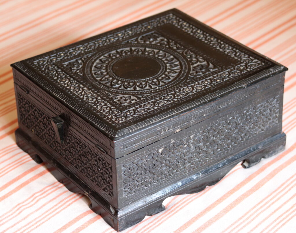 I combed the internet and found two boxes, which were very similar visually to our box. Both of these were featured in international antique selling websites. The first one shows a darkwood box with the description “filigree ornate and sculpted floral decoration on all sides with a sandalwood interior”. It is listed from Visakhapatnam and dates to the 20th century. The other one is much more similar in size but empty inside and no provenance is mentioned, other than the fact that it is a trinket box from the 19th century.