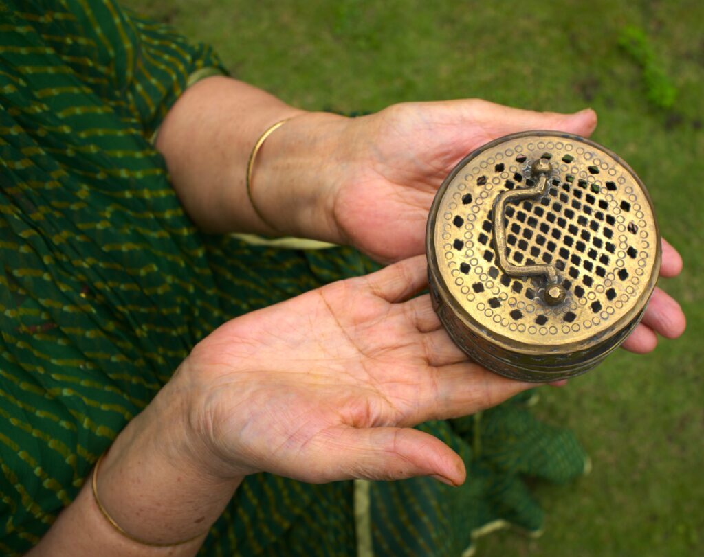 The gift, which could easily fit in the palm of an adult, was presented to Sushi once Daju visited Almora on his leave from work. The small box with a latch, circular lid and a curved handle made for a great source of delight. The box itself, made of brass or peetal, features intricate jaali work and the fine work is clearly visible in its perforated design. In those days, Uttar Pradesh was globally known for its craftsmanship in brassware. Sushi immediately began using it to store the small clothes of her dolls. These dolls, if you’re wondering, were completely handmade—stuffed with cotton and crowned with thick woollen hair.
