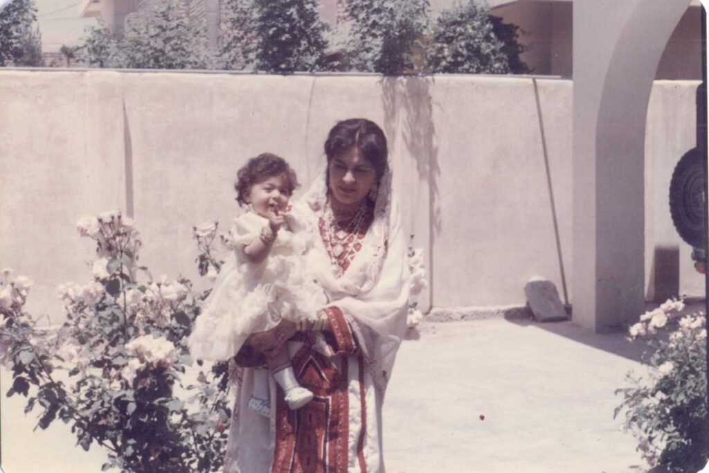 A photo of my mother and me, taken by my grandfather. My mother is wearing a traditional Balochi dress, while I am dressed in a frock