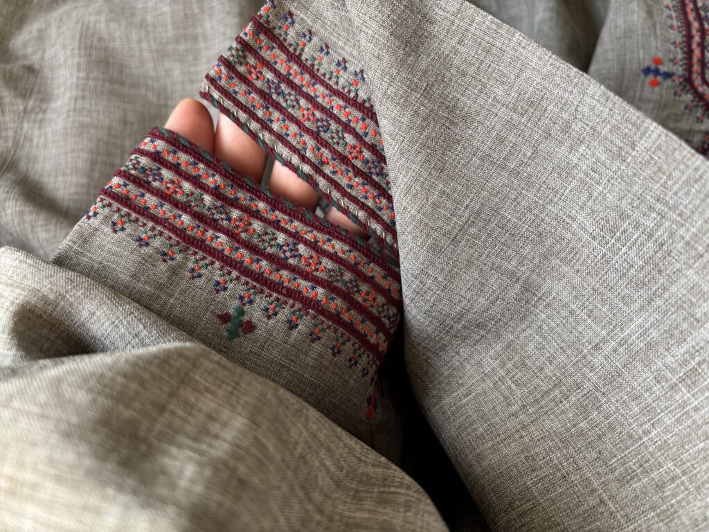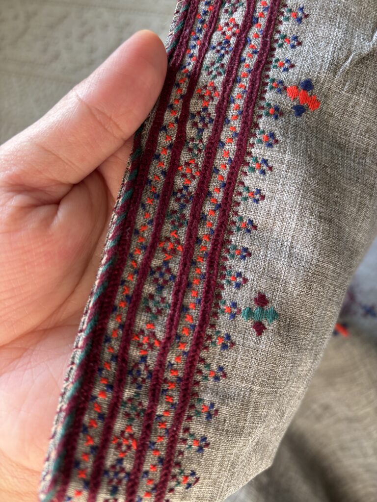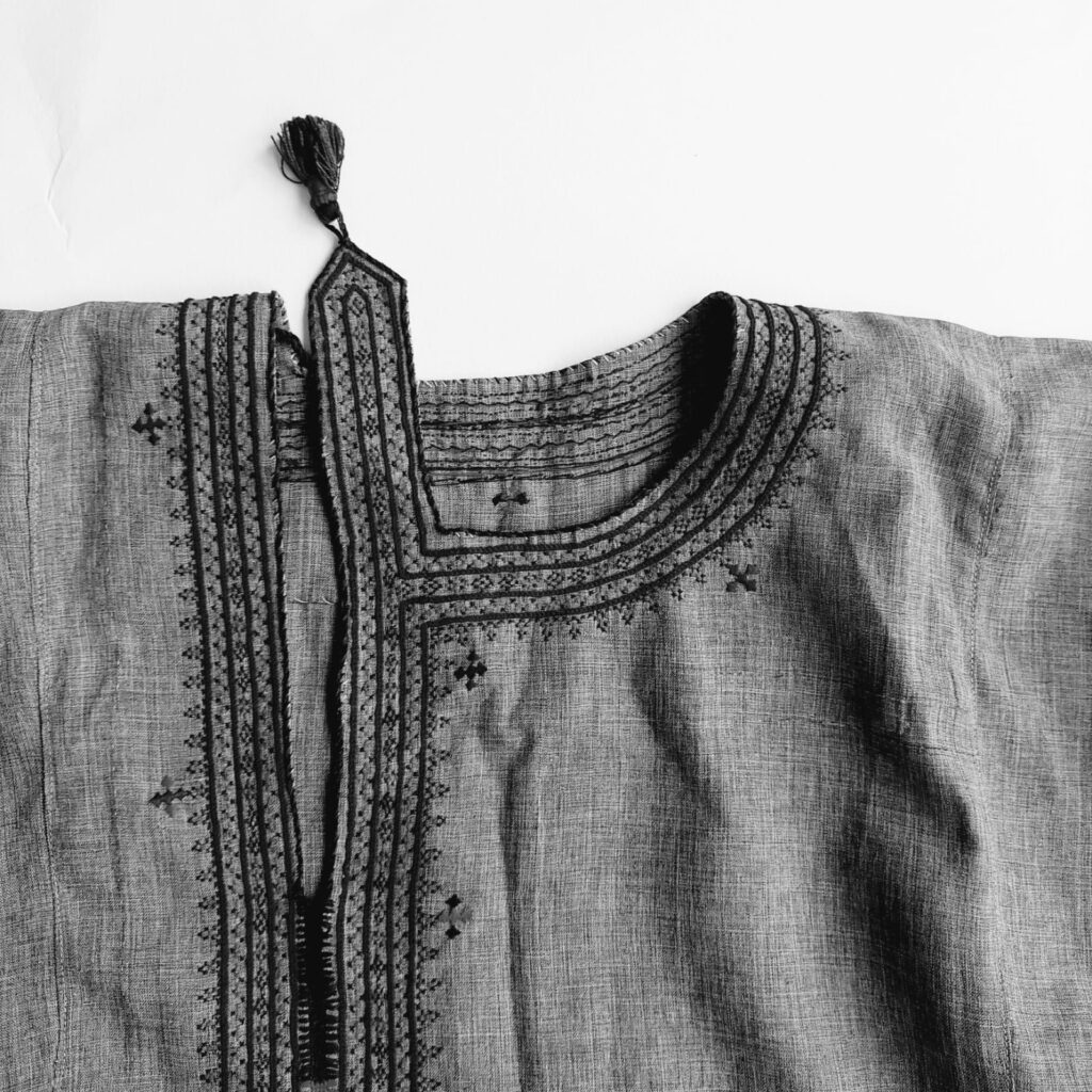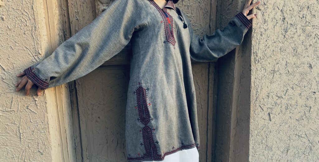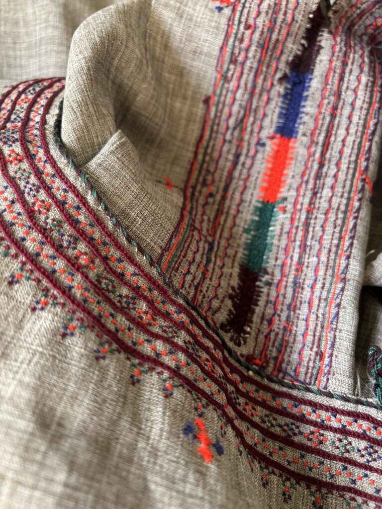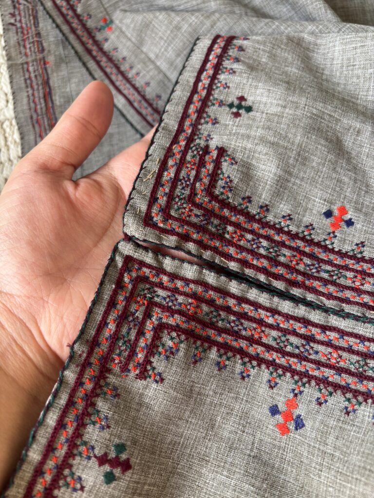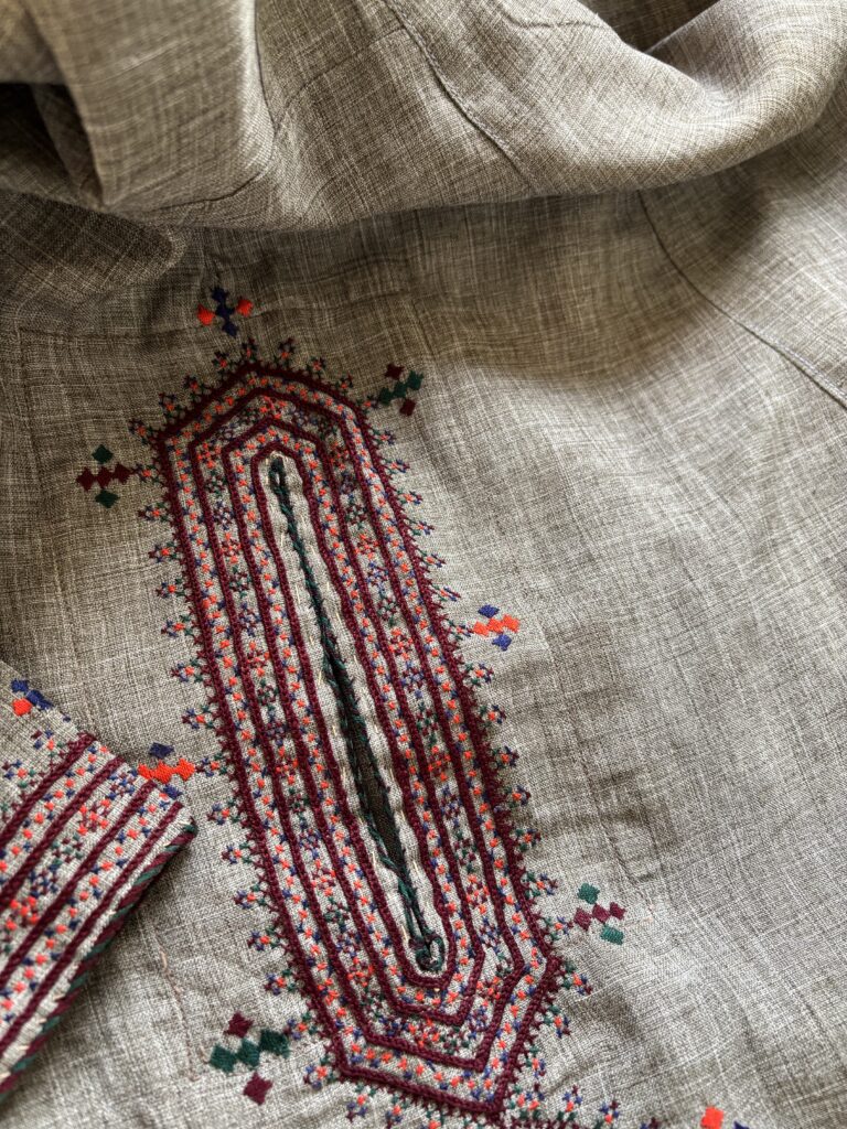 A round neck with a placket on the side for ease and style, with a tassel attached to the loose end that goes through a hoop, is a distinct marker of a Shahi kurta. The wide-panelled tunic remains structured across the shoulders. Adorned with say triki, the local term for cross-stitch, the grey matrassi fabric is complemented by bright colors, particularly through the mausam work at the center of the placket. This material was used not only for its structured, luxurious appearance, but also because it allowed the embroiderer to easily pull out threads to mark the design and was sturdy enough to hold the stitches in place. The pocket on the side has also been embroidered, with the side slits still held together by a small stitch. An impeccably tailored tunic, almost knee-length, flowy with a gentle sheen. The fabric feels as though it whispers of its journey with each move. Encircled by intricate embroidery across the neckline, extending all the way down the front placket, it adds to its grace and accentuates its style. The sleeves are long and tapered, echoing the same threadwork as the neckline and the side slits.